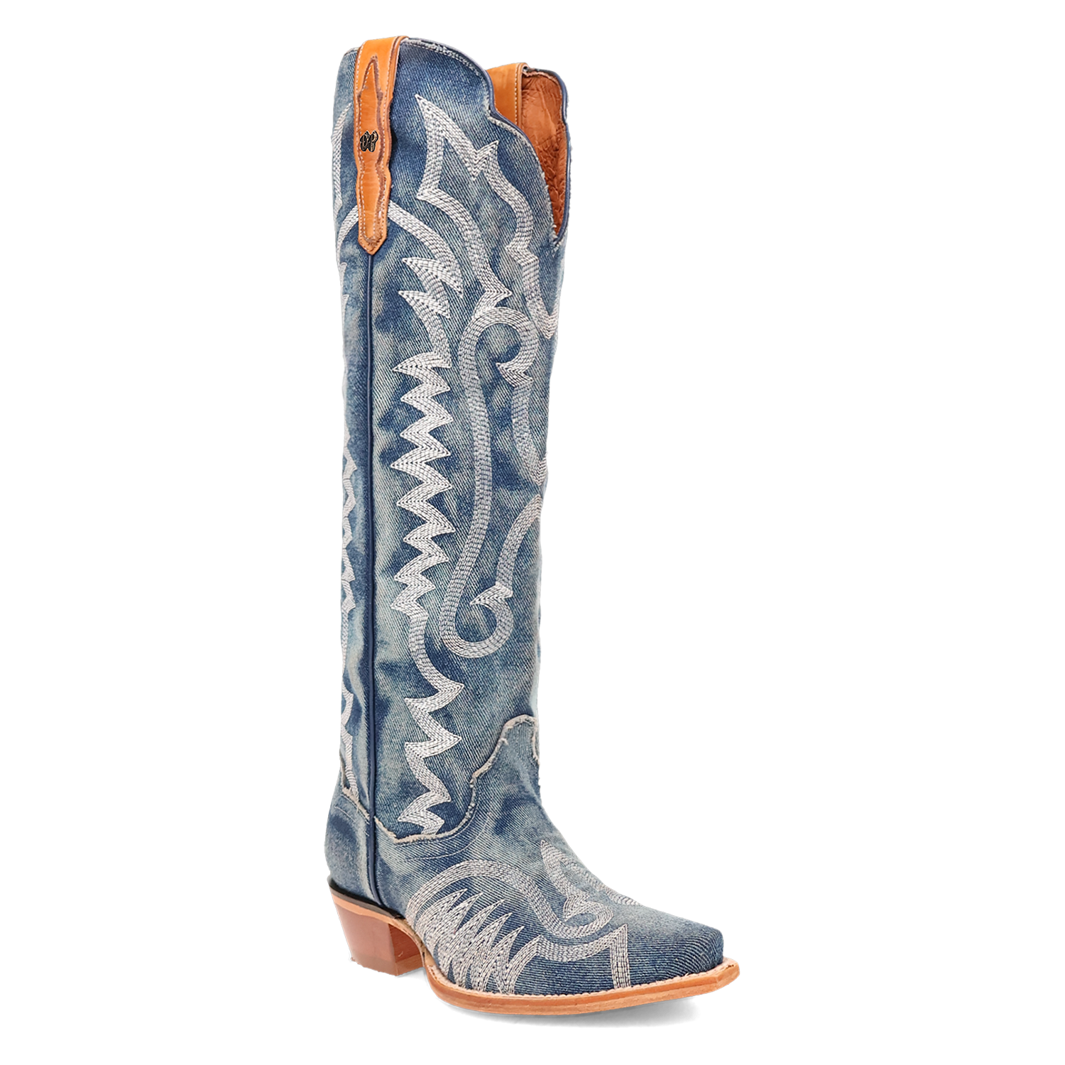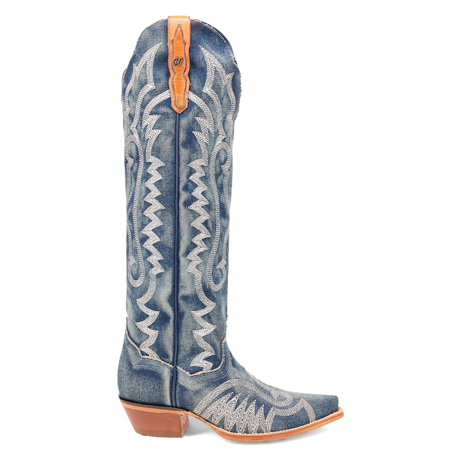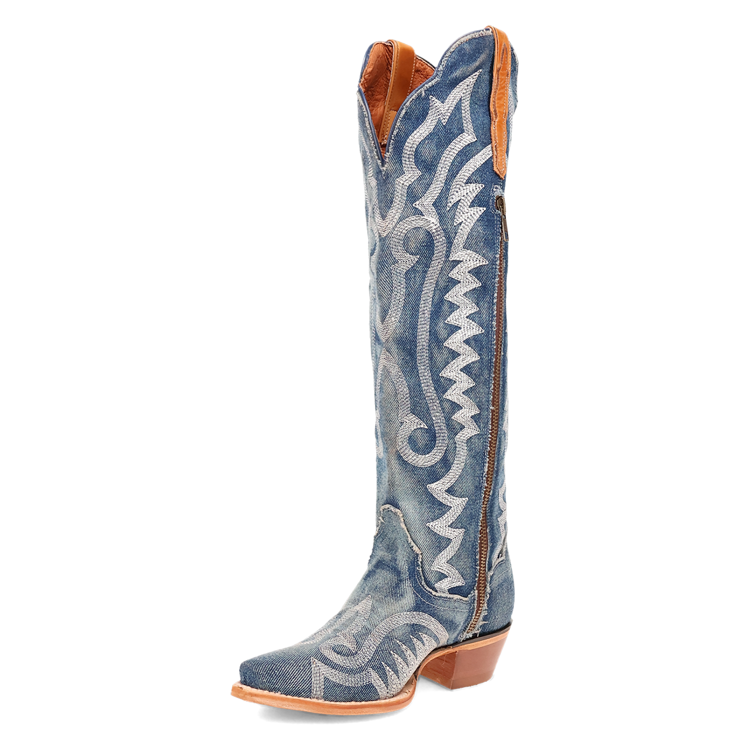 Make a bold statement with every step in this striking 19" tall Western boot, blending modern denim flair with timeless cowboy charm. Designed for the fashion-forward cowgirl, this boot stands out with a unique denim foot and shaft accented by intricate white stitching for a high-contrast, eye-catching look.