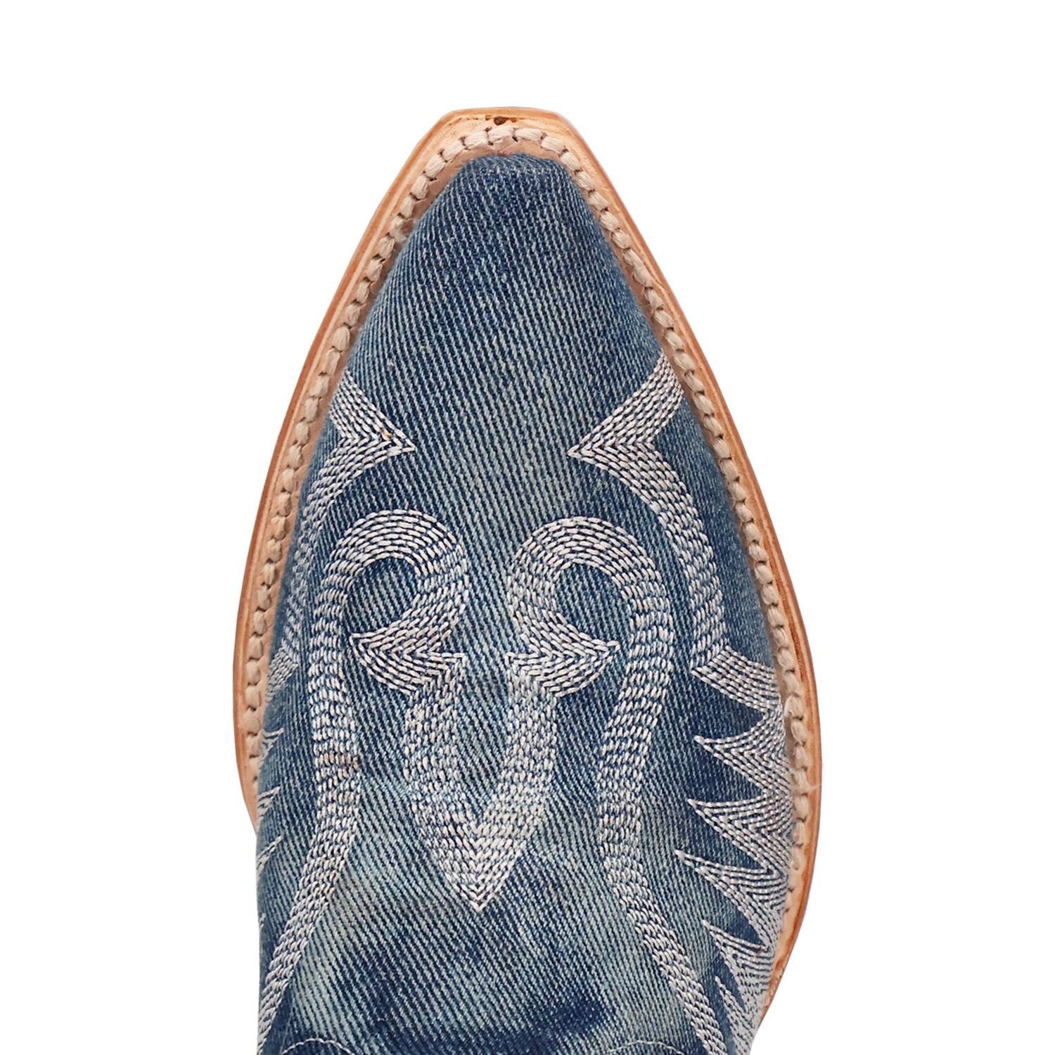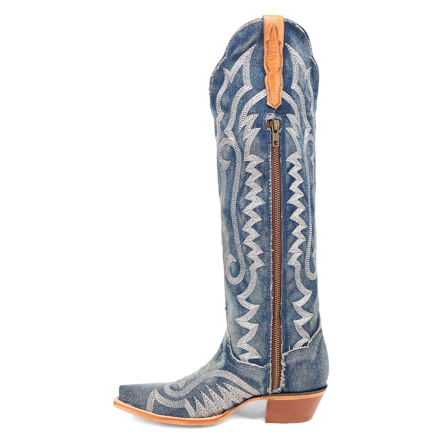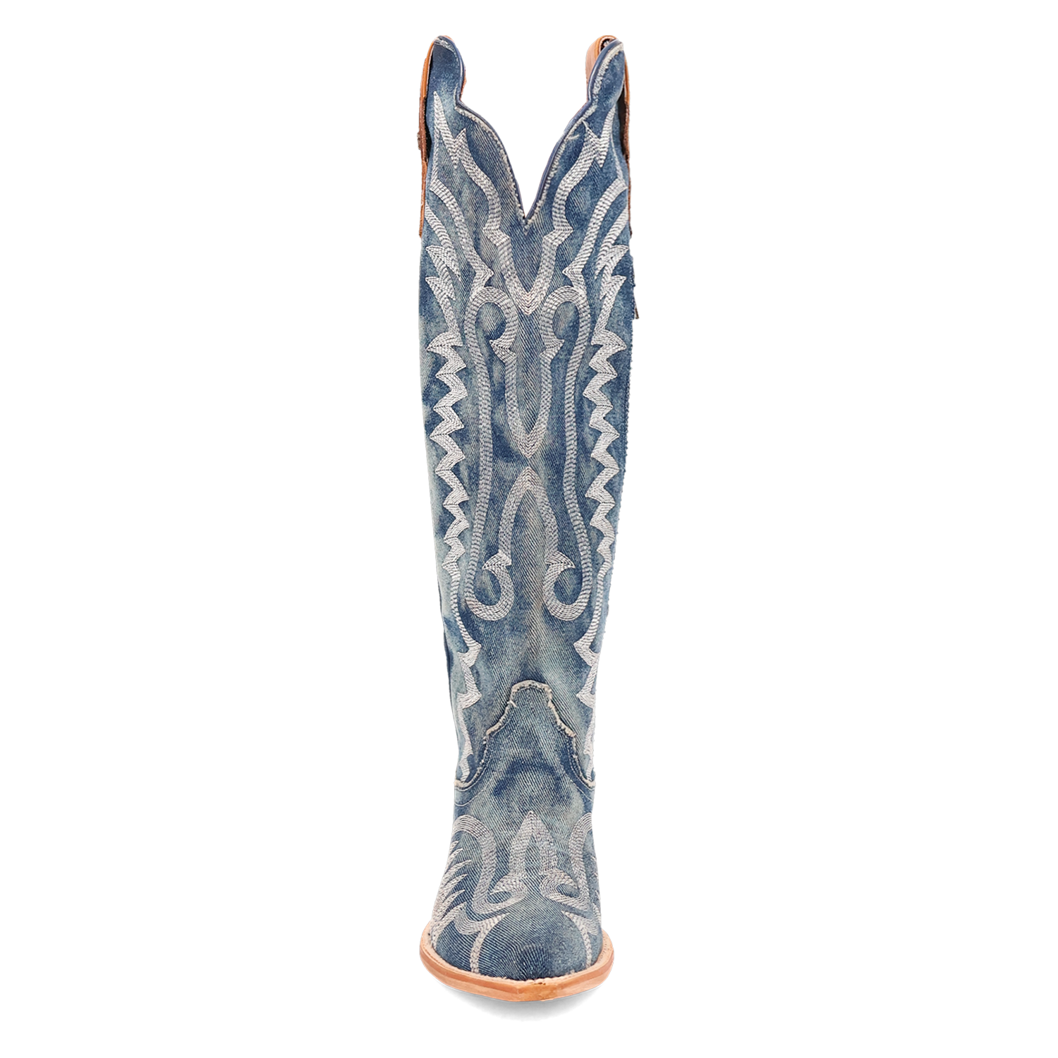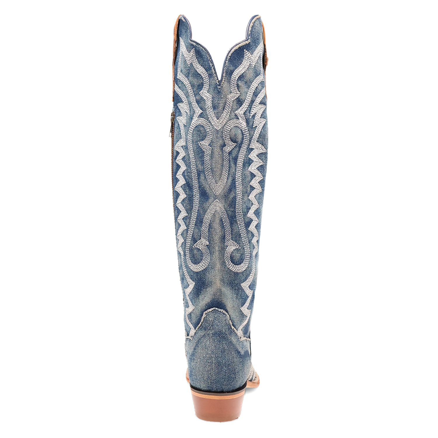 Make a bold statement with every step in this striking 19" tall Western boot, blending modern denim flair with timeless cowboy charm. Designed for the fashion-forward cowgirl, this boot stands out with a unique denim foot and shaft accented by intricate white stitching for a high-contrast, eye-catching look.