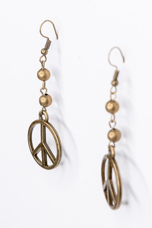 These bronze fishhook earrings feature a peace sign charm. These super simple, lightweight earrings can go with everything! Length: 2"