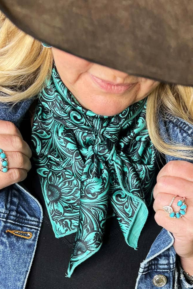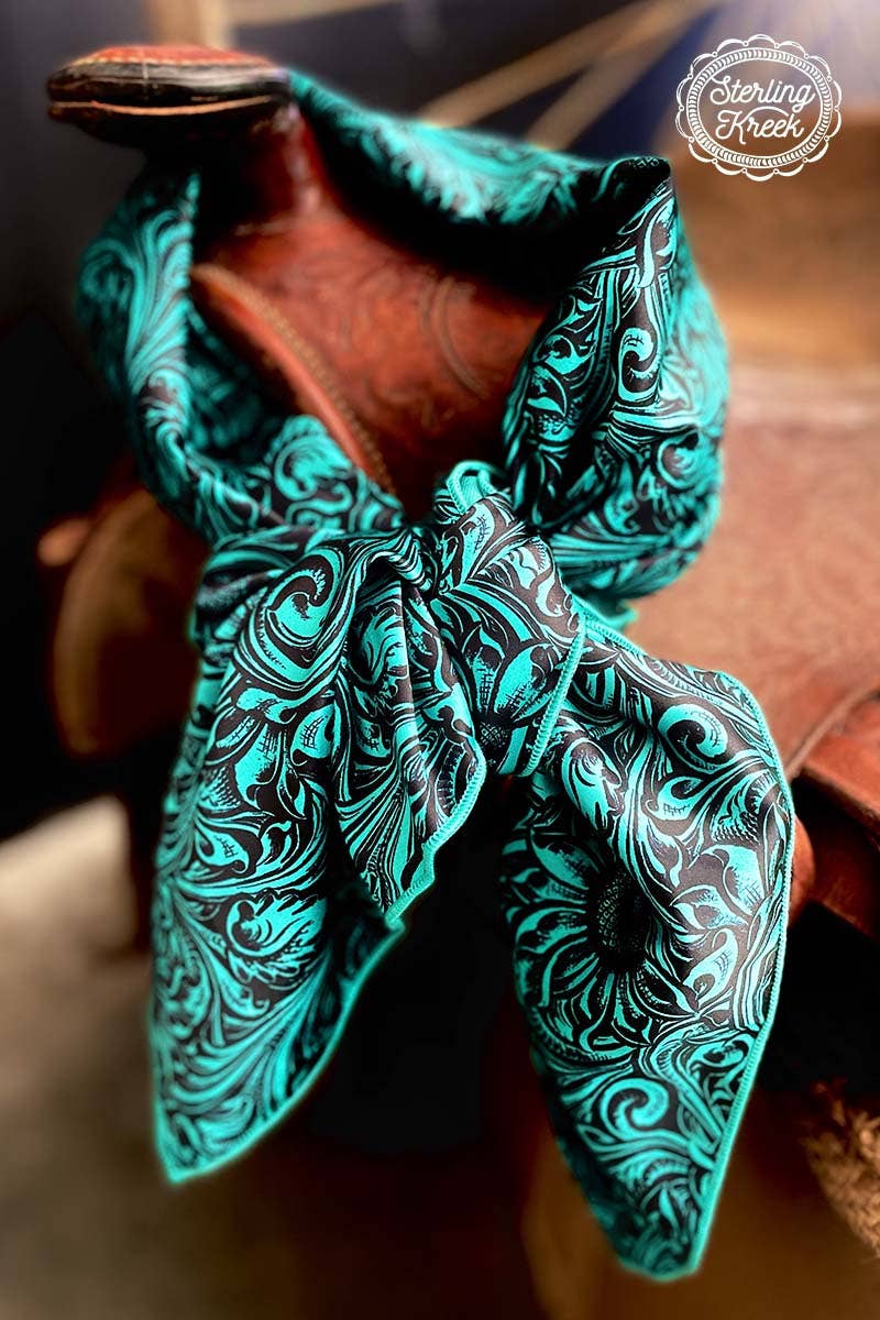 This wild rag is very versatile! This rag can be worn as a cute tied up crop top, or put it up in your hair to style up your updo! & of course, you can wear it as your typical wild rag ladies! It has a silky feel & is designed with a turquoise tooled leather pattern.