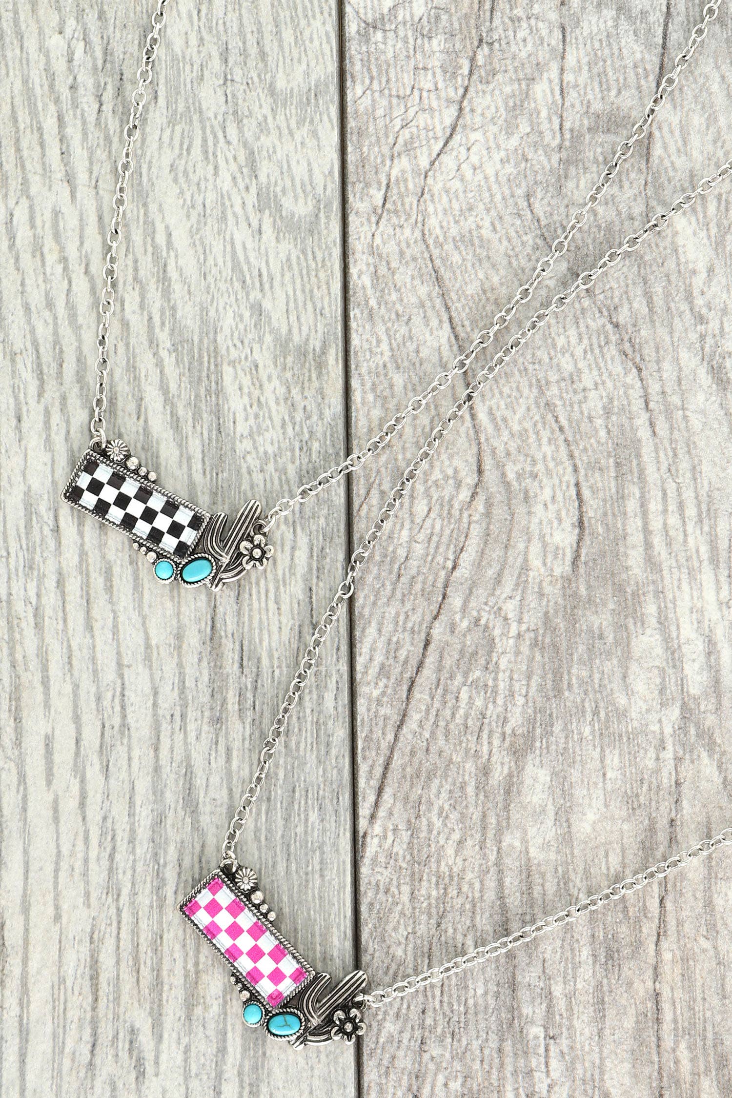 - This Western Checkerboard Cactus Bar Necklace is a unique and stylish piece for any jewelry lover